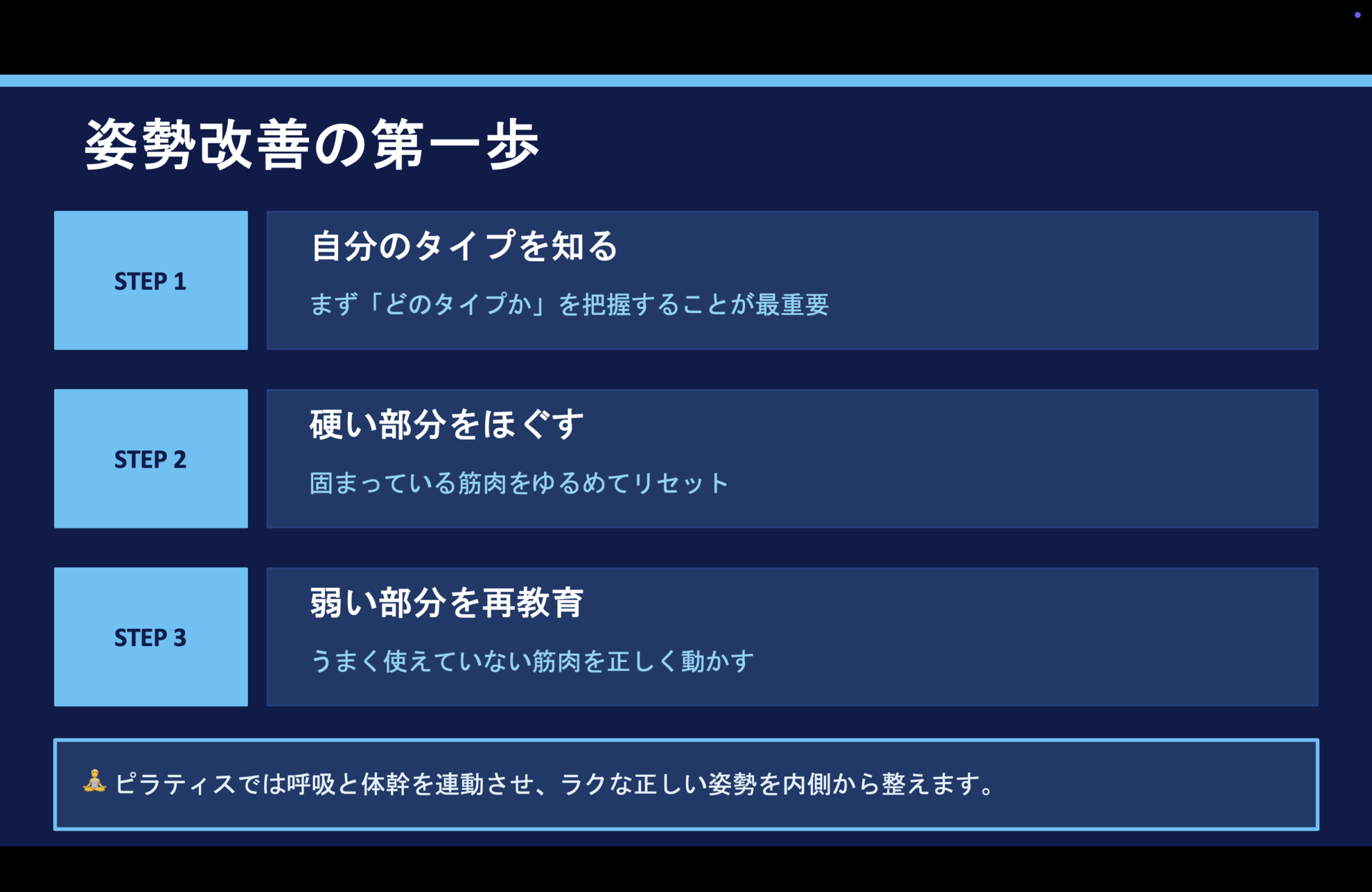 ピラティスでは呼吸と体幹を連動させながら、姿勢を内側から整えていきます。